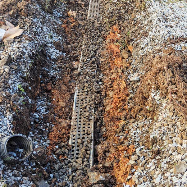 We removed the ineffective drain and installed three 6-inch pipes—one dedicated to roof downspouts, another to box drains, and a third to French drains designed to capture water running off the hillside. The system was engineered to move water efficiently away from the buildings and foundation. After several heavy rains since the installation, the property has remained completely dry—proof that a well-planned drainage system makes all the difference in long-term performance.